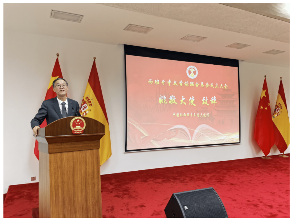 2025年4月29日,西班牙中文学校联合总会成立大会在驻西班牙使馆隆重举行。姚敬大使出席并致辞,华侨大学代表团以及西班牙各地华校、侨界代表等80余人参加。国侨办等100多家单位发来贺信。
